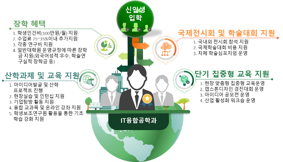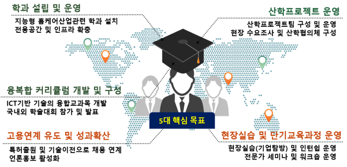 IT융합공학과는 산업통상자원부가 지원하는 지능형 ICT융합기술에 홈케어(Homecare) 서비스를 결합해 미래 주거공간 첨단화를 이끌 수 있는 현장 응용기술 전문인력을 양성하는 사업으로 다음과 같은 5대 핵심목표를 근간으로 운영됩니다.
