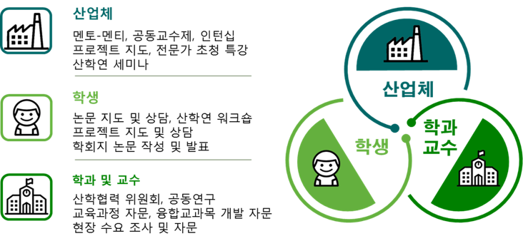 교과목을 필수전공으로 이수하면서 지도교수와 협의하여 관심연구 분야에 따른 참여기업을 매칭하며 이를 통해 참여기업 책임자와 지도교수, 대학원생이 함께 참여하는 팀을 구성합니다.